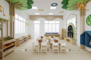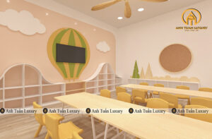 Dựa trên tiêu chuẩn thiết kế nội thất mầm non và kinh nghiệm thi công thực tế, khoảng cách bàn ghế nên được bố trí như sau: